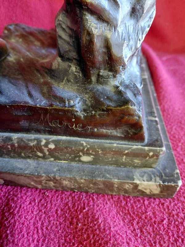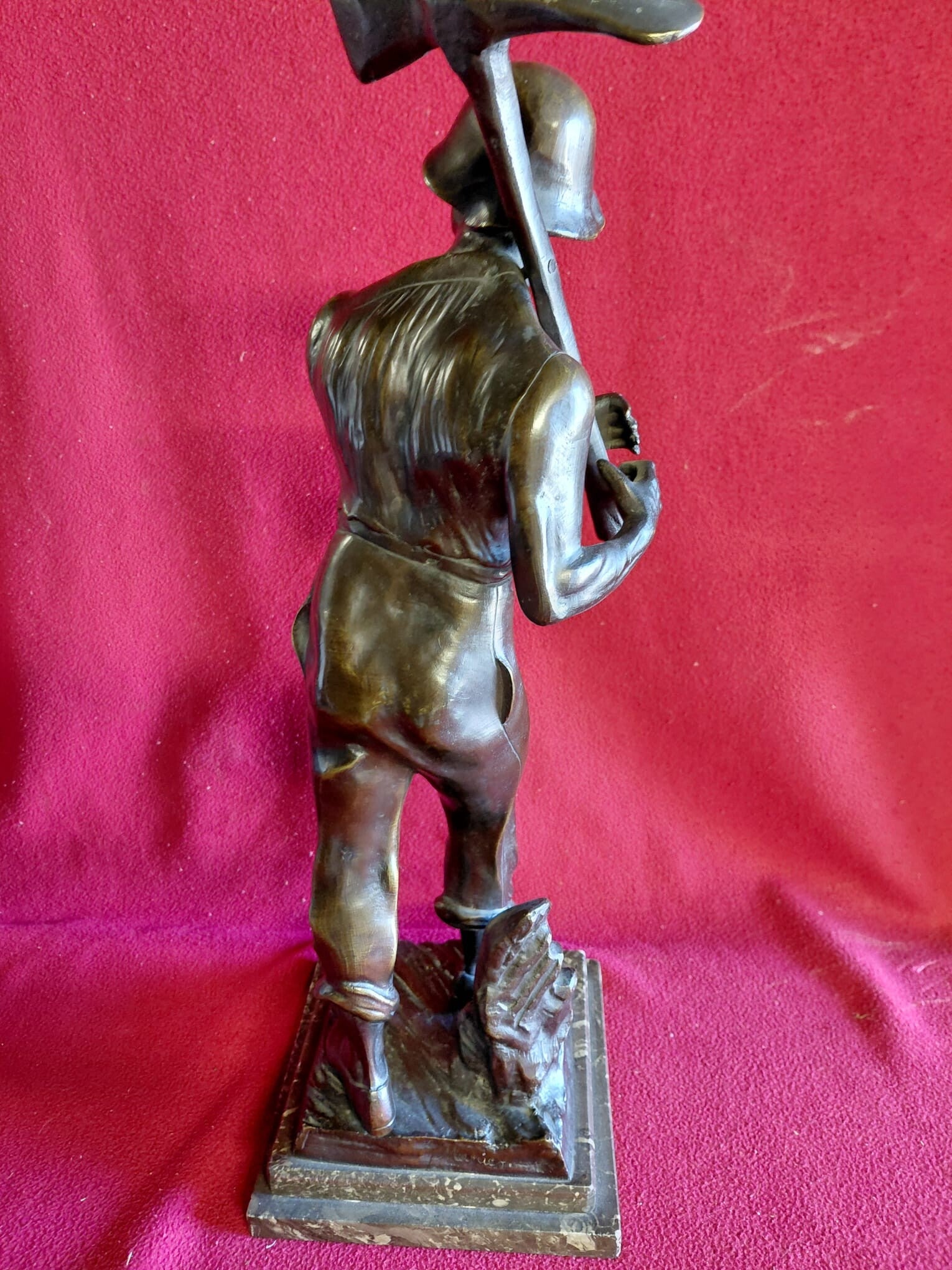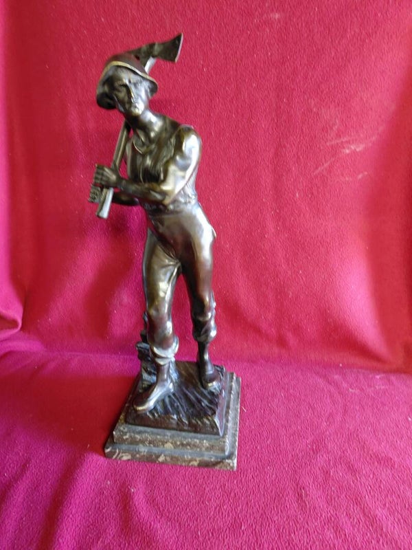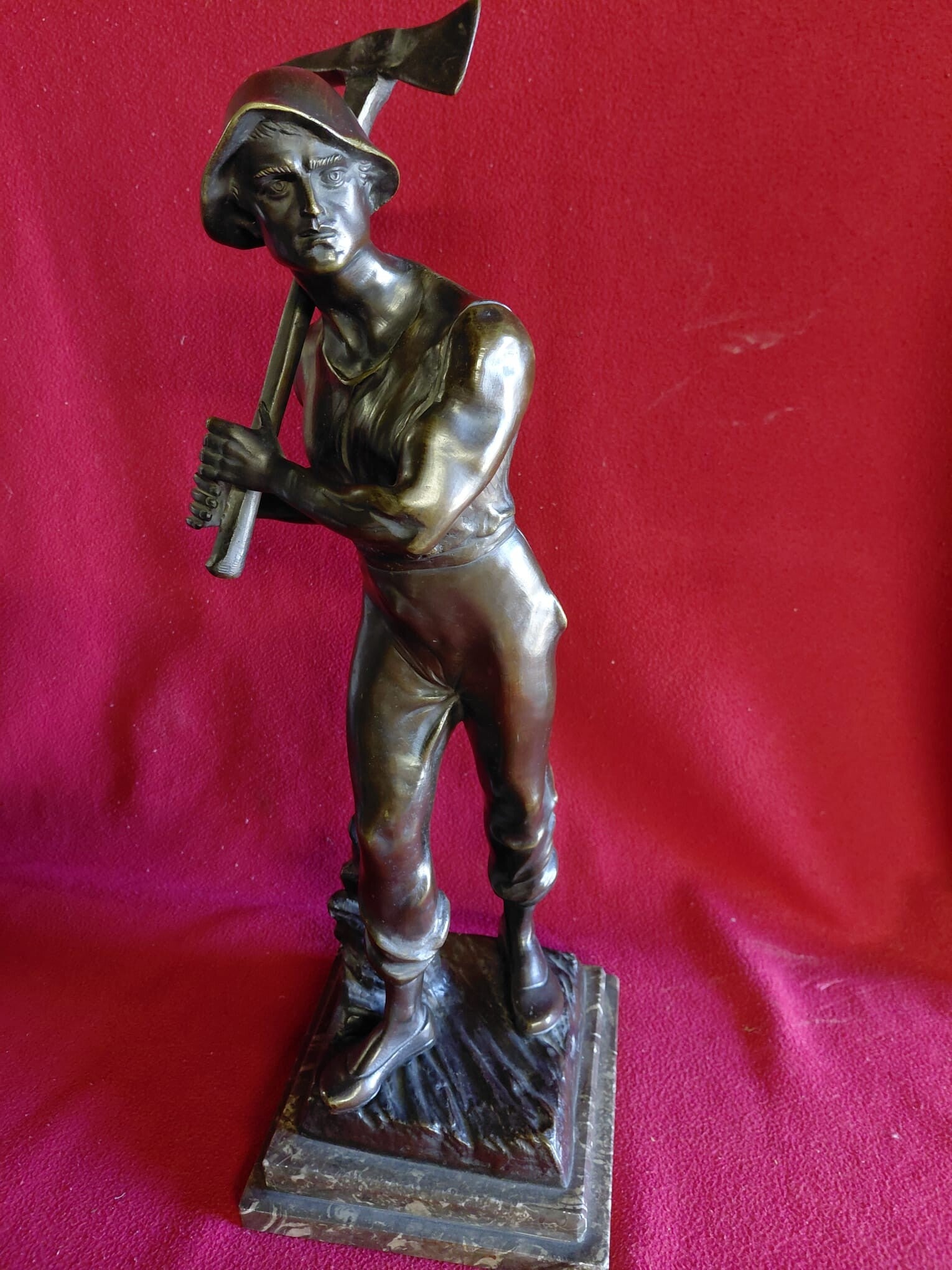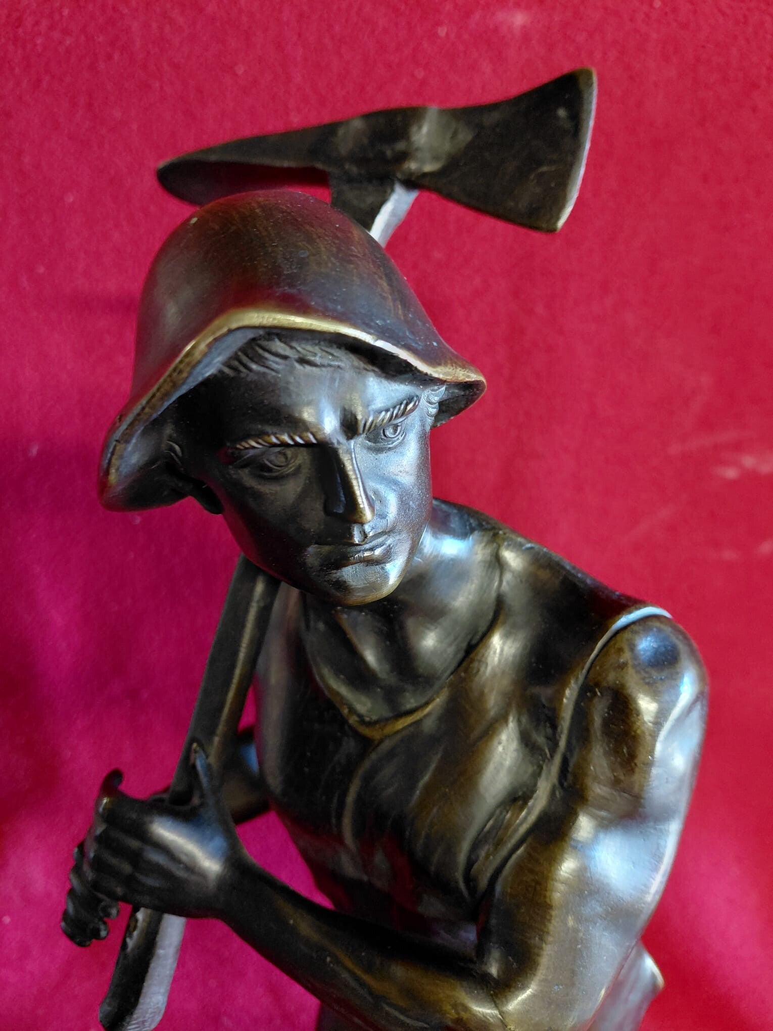 Antique bronze statue of a miner. This type of sculpture was very popular in the early 20th century (Art Nouveau/Art Deco period) and often centers on the pride of manual labor. Signed by Manier Realistic style, typical of the social art movements of the early 20th century that honored workers. height 53.5 cm #bronze #miner #art nouveau #art deco #labor #early 20th century.